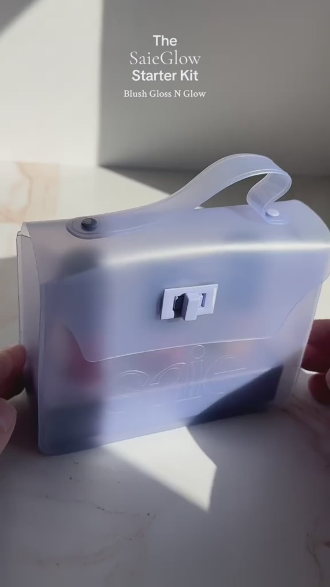 Everything you need to start your very own SaieGlow™ in style. Hydrate and highlight with Glowy Super Gel in NEW! Roseglow, add a touch of natural flush with Dew Blush in Baby, and get a glossy, juicy lip with Glossybounce™ in Play. Head out with these essentials in your chic jelly bag for a guaranteed glowy day!